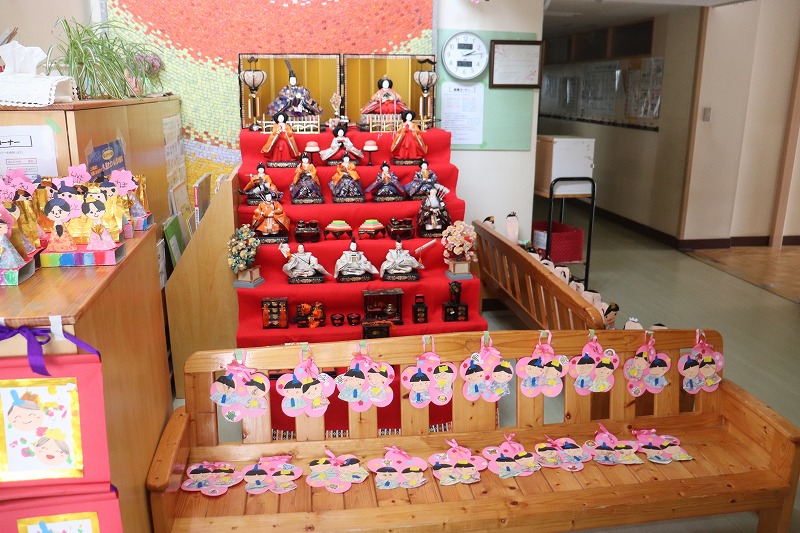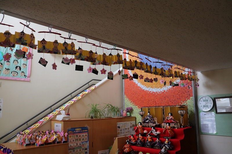 保育園の図書コーナーにひな人形と、子ども達が制作したひな飾りが飾られました。登降園の際にぜひ見て頂けたらと思います。今年もかわいいひな飾りが多く飾られました。