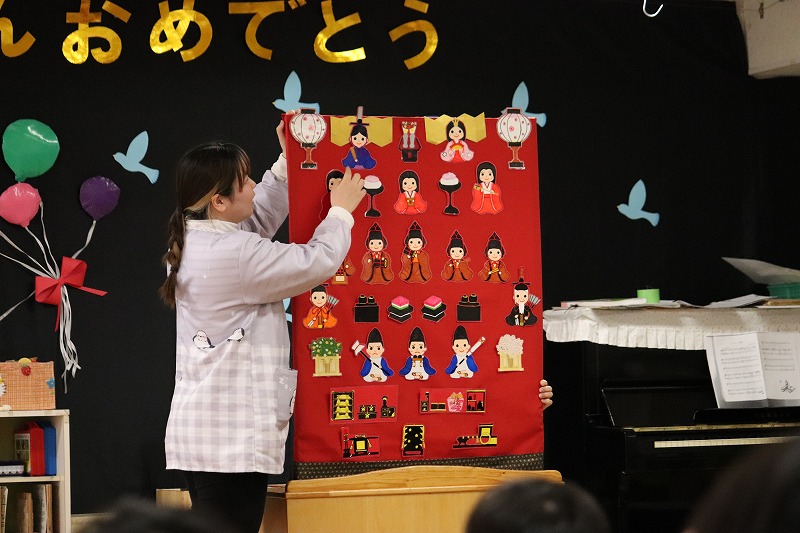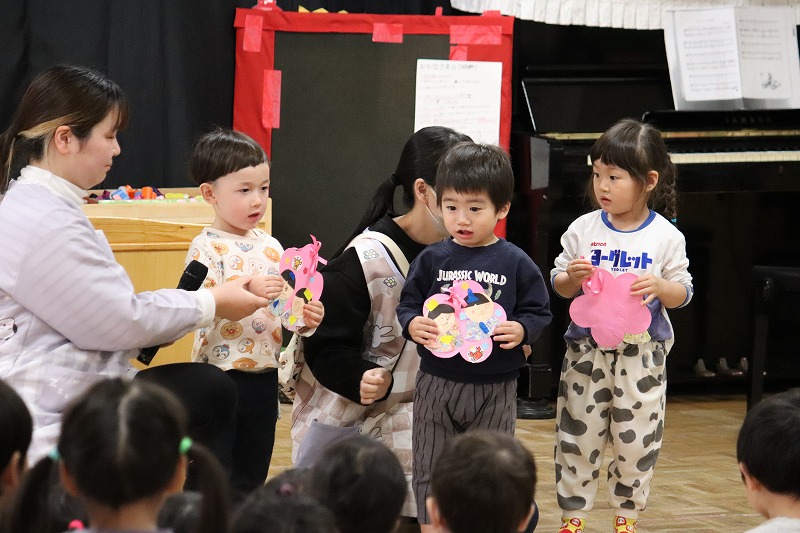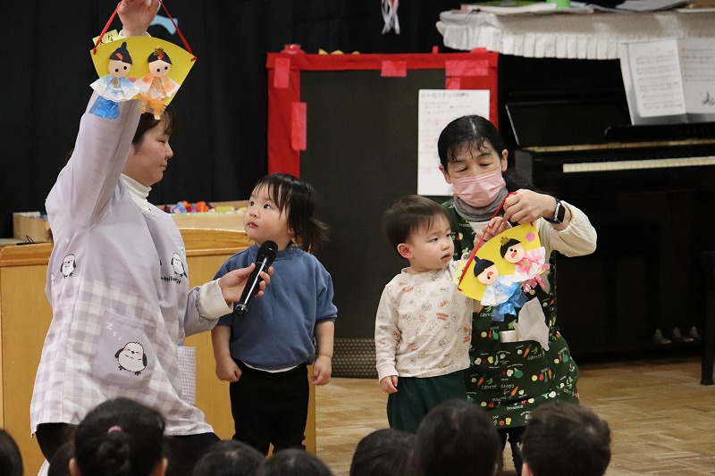 今日はひなまつりの集会を行いました。0才児から5才児・地域の方まで、作った雛飾りの制作を前で発表してくれました。