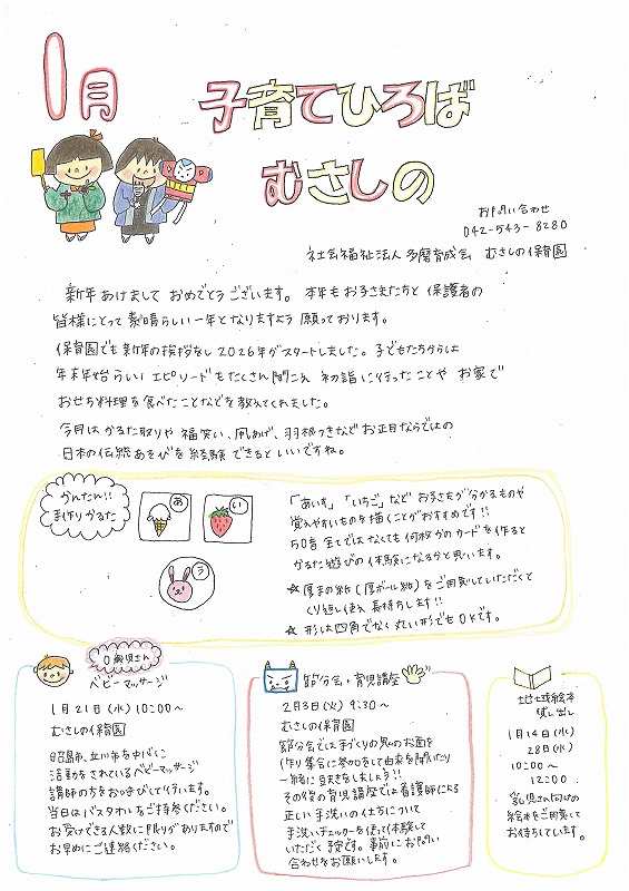 あけましておめでとうございます。本年もよろしくお願いいたします。1月の情報誌を更新しました。今月は1月21日にむさしの保育園にて、ベビーマッサージを行います。また2月3日には、むさしの保育園にて節分会・育児講座を予定しております。是非ご参加おまちしております。